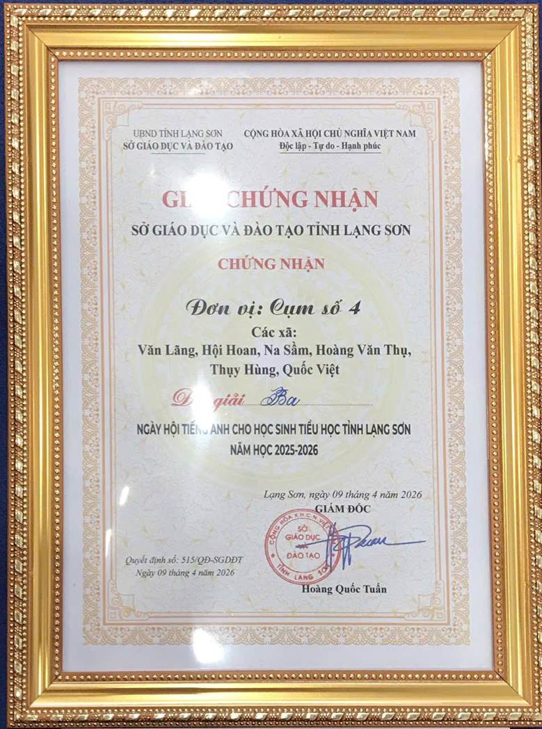 Trải qua 3 phần thi: chào hỏi, giới thiệu đội chơi; tài năng; hiểu biết. Với sự cố gắng nỗ lực đội thi cụm số 4 Vinh dự đạt Giải Ba cuộc thi Ngày hội giao lưu tiếng Anh cho học sinh tiểu học tỉnh Lạng Sơn năm học 2025 -2026. Và đạt giải Biệt đội thuyết trình tài ba.