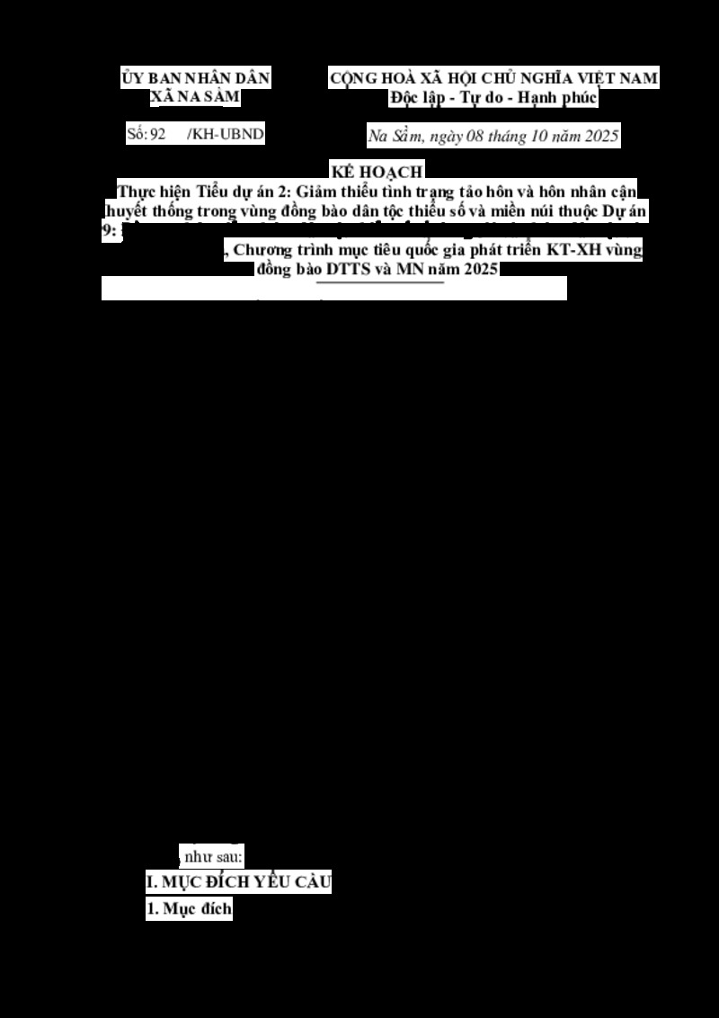 | Tiêu đề văn bản | Thực hiện Tiểu dự án 2: Giảm thiểu tình trạng tảo hôn và hôn nhân cận huyết thống trong vùng đồng bào dân tộc thiểu số và miền núi thuộc Dự án 9: Đầu tư phát triển nhóm dân tộc thiểu số rất ít người và nhóm dân tộc còn nhiều khó khăn,S và MN năm 2025 | ||