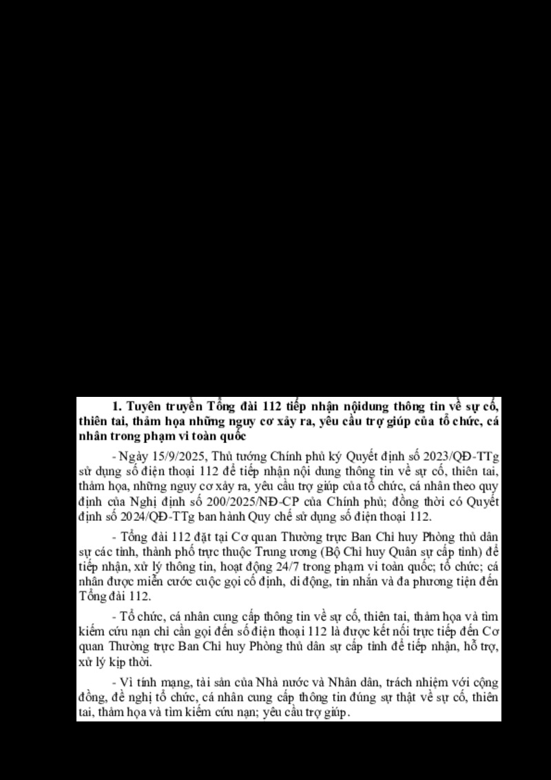 | Tiêu đề văn bản | tuyên truyền: Tổng đài 112 tiếp nhận nội dung thông tin về sự cố, thiên tai, thảm họa những nguy cơ xảy ra, yêu cầu trợ giúp của tổ chức, cá nhân trong phạm vi toàn quốc; công tác phòng, chống bệnh dịch tả | ||